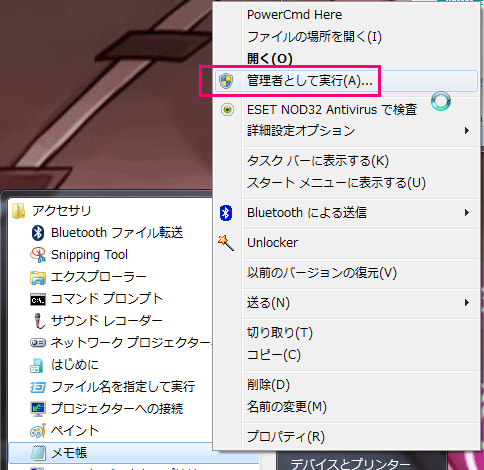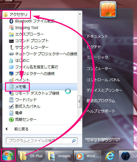 - [スタートボタン]をクリックし、[アクセサリ]にある、[メモ帳]を右クリックします。