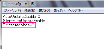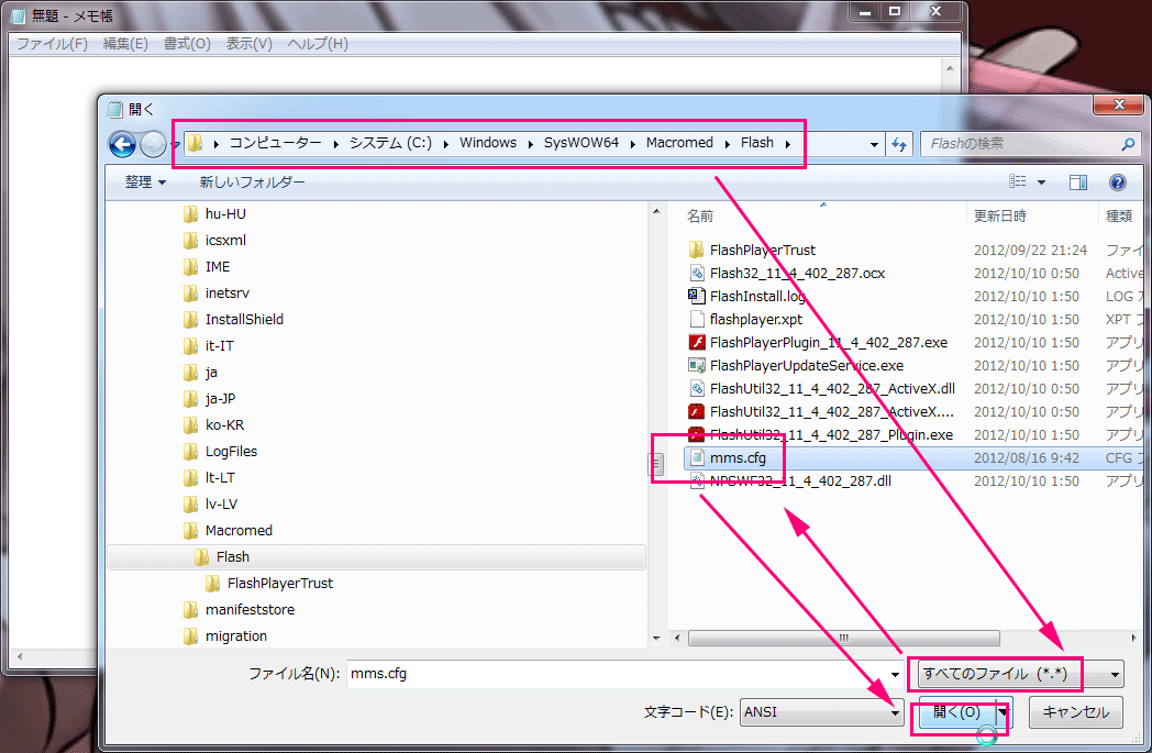 C:\Windows\System32\Macromed\Flash\mms.cfgを、64ビット版場合、C:\Windows\SysWOW64\Macromed\Flash\mms.cfgを開きます(スクリーンショットは64ビット版)。